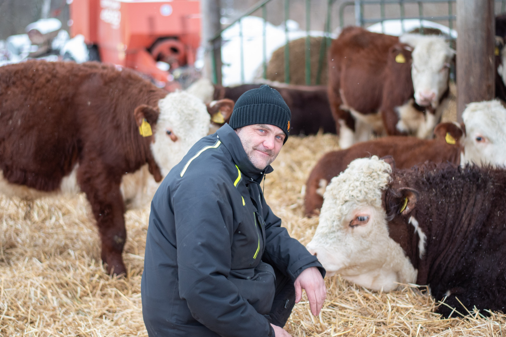 – Det hela startade med att jag och frun fick två mjölkkor i bröllopspresent på pin kiv av våra kompisar. De hade nog inte räknat med att min fru skulle bli jätteglad. Det dröjde inte många veckor innan vi köpte fler kor, men då bestämde vi oss för Hereford som är en väldigt lugn ras som passar oss. Det var 2017 och sedan dess har vi behållit alla kvigkalvar och byggt vidare på dem, säger han.